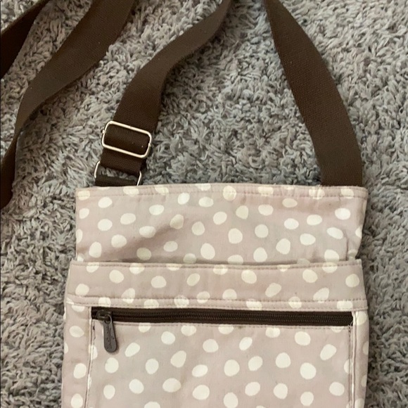 Tan crossbody with brown adjustable strap. Multiple pockets. Adorable accessory with any fall outfit!