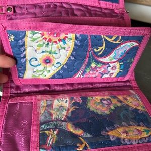This is a cute wallet/crossbody. It has SEVERAL pockets and compartments. Check book holder. Can even hold cell phone. There is a zipper on back also. The strap is removable. The color is a bright multicolor paisley design 💗