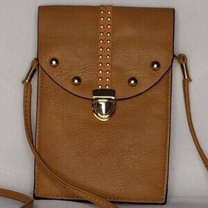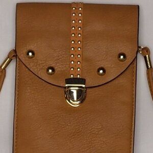 Cross body handbag light tan with gold trim. Clear back for phone access. Only used once and in good condition. It measures 7" X 4 3/4".