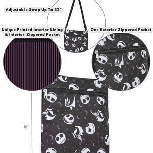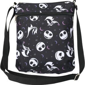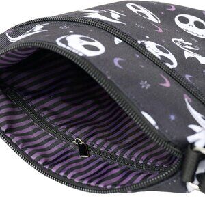 The Nightmare Before Christmas crossbody bag featuring Jack Skellington & Zero. Measuring 9"x7"x1.5", this shoulder bag offers the perfect amount of storage space for your essentials. The black polyester canvas exterior provides a cruelty-free alternative to traditional materials. Perfect for theme park visits, concerts, or daily errands, this versatile bag keeps your belongings secure while showcasing your love for Nightmare Before Christmas.