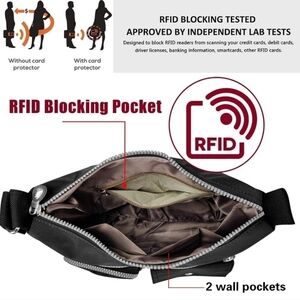 ANTI - THEFT DESIGN: Back zipper design with Anti-theft function to protect yours belongs; RFID protection pocket can protects your personal information from being stolen by a RFID scanner (e.g. credit cards, passports, and driver's license)