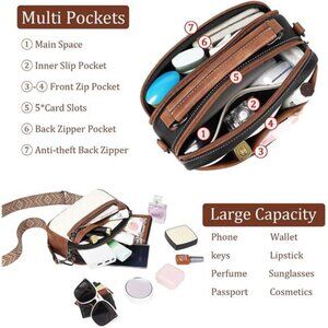 The leather crossbody purse features 1 main compartment with 1 inner zipper pockets.External with 3 Front zip pockets + 1 Back zip pocket. Interior- 5 RFID Card Slots to conveniently organize your cash and cards. Multi pockets design with large capacity can meet your daily needs. You can store your cell phone, wallet, keys, lipstick, perfume,napkins,passport, cosmetics, sunglasses and other daily necessities.