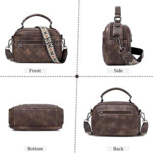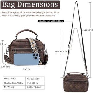 This purses for women crossbody bag is 9.5"(L) x 3.5"(W) x 6.6"(H) in size. Weight: 0.53Kg/1.16Lb. The length of the shoulder strap can be adjusted to 37.8-58.8 In, and the width of the shoulder strap is 1.5in. This adjustable straps long enough for any person”s height, and the appropriate body weight of bag prevent womens crossbody purse from flips upside down if you pick it up by the strap.