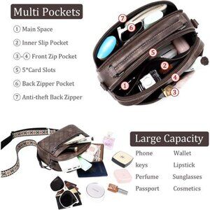 The leather crossbody purse features 1 main compartment with 1 inner zipper pockets.External with 3 Front zip pockets + 1 Back zip pocket. Interior- 5 RFID Card Slots to conveniently organize your cash and cards. Multi pockets design with large capacity can meet your daily needs. You can store your cell phone, wallet, keys, lipstick, perfume,napkins,passport, cosmetics, sunglasses and other daily necessities.