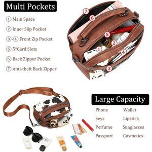 The leather crossbody purse features 1 main compartment with 1 inner zipper pockets.External with 3 Front zip pockets + 1 Back zip pocket. Interior- 5 RFID Card Slots to conveniently organize your cash and cards. Multi pockets design with large capacity can meet your daily needs. You can store your cell phone, wallet, keys, lipstick, perfume,napkins,passport, cosmetics, sunglasses and other daily necessities.