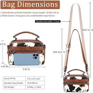 This purses for women crossbody bag is 9.5"(L) x 3.5"(W) x 6.6"(H) in size. Weight: 0.53Kg/1.16Lb. The length of the shoulder strap can be adjusted to 37.8-58.8 In, and the width of the shoulder strap is 1.5in. This adjustable straps long enough for any person”s height, and the appropriate body weight of bag prevent womens crossbody purse from flips upside down if you pick it up by the strap.