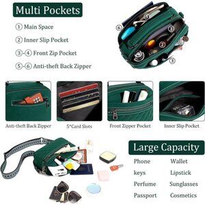 The leather crossbody purse features 1 main compartment with 1 inner zipper pockets.External with 3 Front zip pockets + 1 Back zip pocket. Interior- 5 RFID Card Slots to conveniently organize your cash and cards. Multi pockets design with large capacity can meet your daily needs. You can store your cell phone, wallet, keys, lipstick, perfume,napkins,passport, cosmetics, sunglasses and other daily necessities.