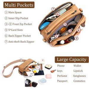 The leather crossbody purse features 1 main compartment with 1 inner zipper pockets.External with 3 Front zip pockets + 1 Back zip pocket. Interior- 5 RFID Card Slots to conveniently organize your cash and cards. Multi pockets design with large capacity can meet your daily needs. You can store your cell phone, wallet, keys, lipstick, perfume,napkins,passport, cosmetics, sunglasses and other daily necessities.