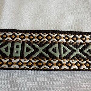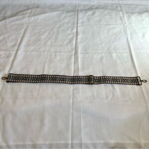 Stylish bag strap with a geometric pattern. Features black, white, and gold colors. Perfect for adding a unique touch to your bag.