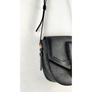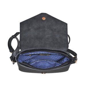 Urban Expression crossbody bag. Made from a vegan, faux leather material. It's a dark grey, blackish color. Adjustable strap, magnetic button closure and a zipper pocket on the back side. The inside is lined and has another zipper pocket.