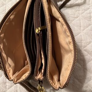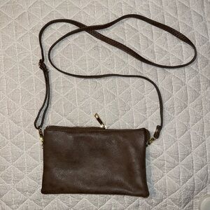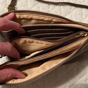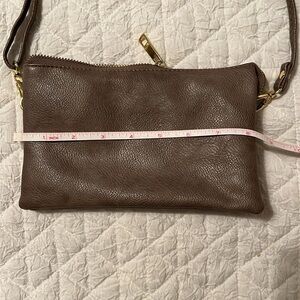 Small crossbody purse with a lot of pockets. Color is brown grey. No brand name. Hold a lot in a little bag.