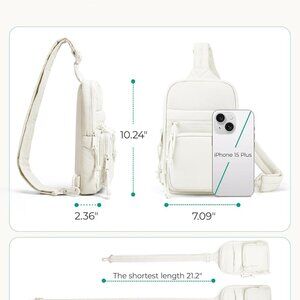 - - : This crossbody sling bag features a spacious 2.8L interior that fits your iPhone 15 Plus, portable charger, sunglasses and passport. Measuring just 7.1x10.2x2.4 inches, it's the ideal everyday carry