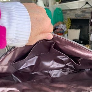 @regine Thank you for your patience and for checking out my closet! It does not say, the purse itself is faux leather. The fabric feels like a cross between nylon and satin- plyable like satin, but the form is more structured like nylon. I am happy to post some more pictures if you like!