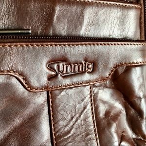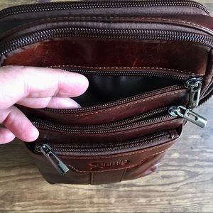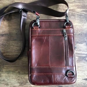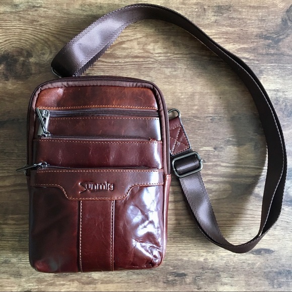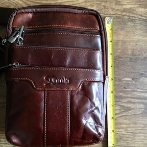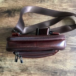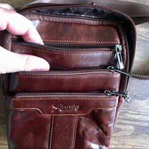 This is a cool crossbody in dark brown faux leather.