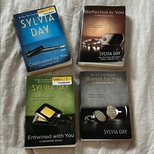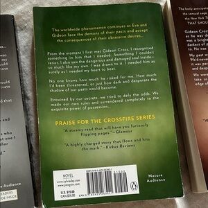 Explore the captivating Crossfire series by . This set includes four novels with striking blue, green, black, and brown covers. Perfect for your home office library.