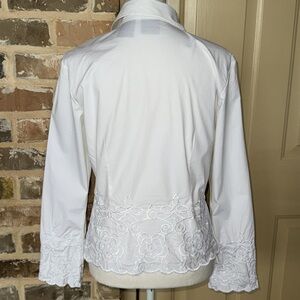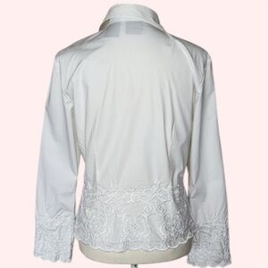 This elegant white top features a notched collar and long sleeves, perfect for a polished look. Hook & Eye closure down the front. Hem and cuffs are embellished with floral scrolling embroidery adding a sophisticated touch to its classic button-down style. Ideal for both formal and casual settings, it offers a refined yet versatile wardrobe staple. Cotton & Spandex fabric provides stretch. Approximate measurements in photos. Excellent condition.