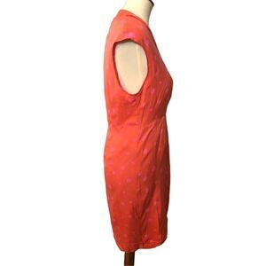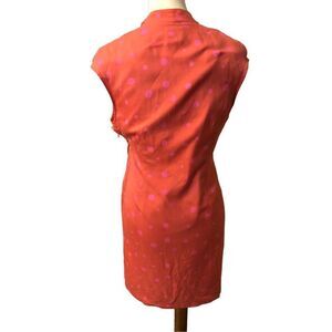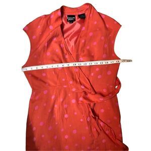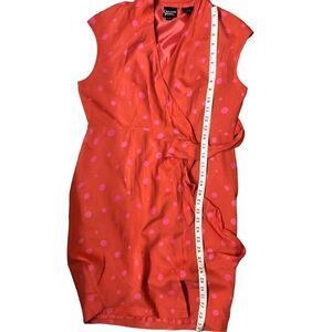 Crossing Pointe silk faux wrap polka dot dress in red/coral with pink polka dots. Hidden side zipper, small slit at front hen for walking comfort. Fully lined. 100 percent silk.