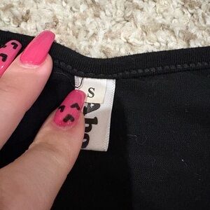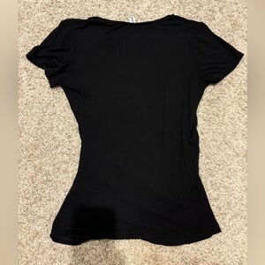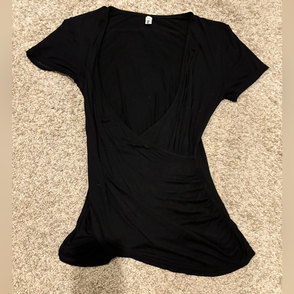 This is super soft and stretchy, has a deep V crossover style in the front. Has some ruching on the sides. No flaws. It’s a great dress up basic