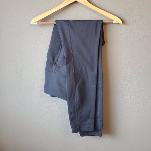 Black leggings with pockets, microfleece lined! Perfect for cold weather hikes, walks, runs, or any other outdoor adventures! Zippered pocket on the right thigh with an additional non zippered pocket behind it and on the left thigh. Love these, they just got to be too big on me. Worn less than a dozen times. Slight pilling on the inside of the waist band.