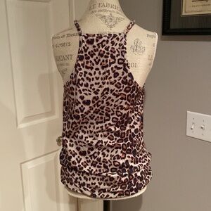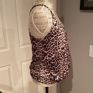 Animal print tank with cross cross design front. Lightweight and loose at the waist for a great comfortable fit. Adjustable straps. Soft touch fabric.