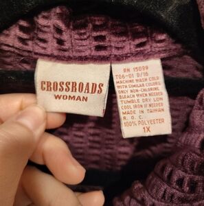 The Crossroads Purple Textured Velour Longline Button Down Shirt Jacket Shacket in size 1X is a stylish and versatile outerwear piece for women. Made from polyester with a knit fabric type, it features a solid purple color with a textured velour design. This mid-length jacket has long sleeves and a button closure, making it suitable for travel, parties, casual outings, and more. With its plus size fit and basic jacket style, it is perfect for the winter, fall, and spring seasons, adding a touch of lagenlook, gothic, and grandma-inspired flair to any wardrobe.