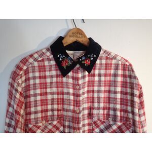 Crossroads Red Plaid Shirt Velvet Collar Rose Embroidered Size Large Western