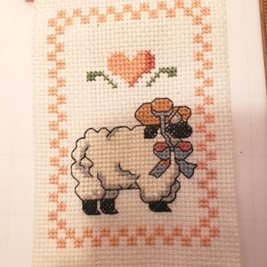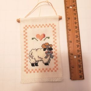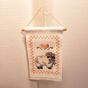 HAND CRAFTED Cross-stitch Mini Banner with a Heart and a Ewe Sheep in a Bonnet