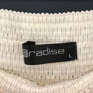 Crotchet mini skirt size large but fits very tight. I am usually a medium and it was small on me. It does have an elastic waistband!