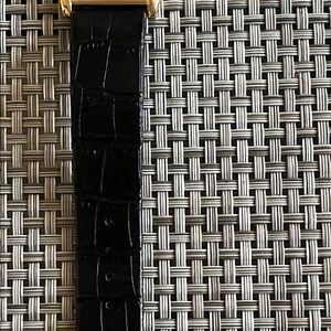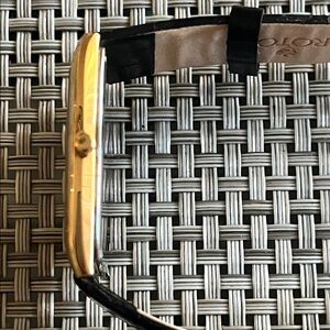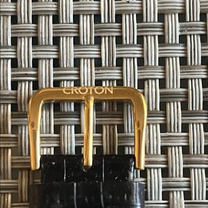 Stylish Croton watch with a gold-tone case and black leather strap. Features Roman numeral markers on a white dial. Condition like new .