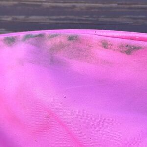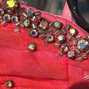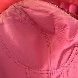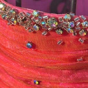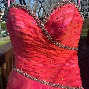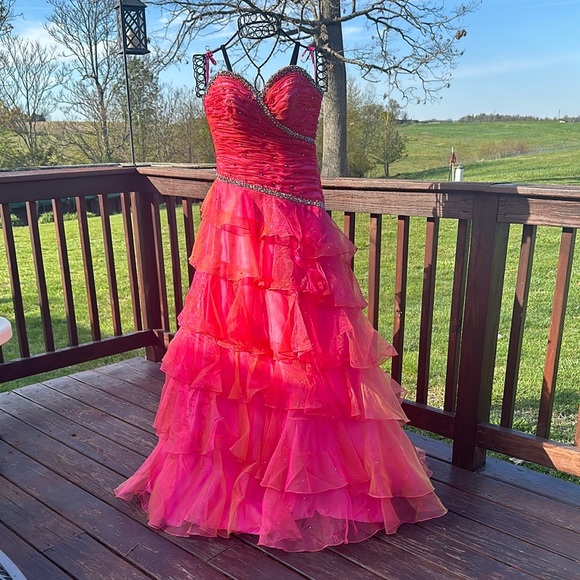 This enchanting pink prom gown features a sweetheart neckline and a ruched bodice that adds a touch of elegance. The tiered skirt is adorned with cascading ruffles, creating a whimsical and dramatic silhouette perfect for making a statement at any special occasion. Missing some stones under the arms.