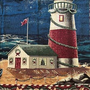 Beautiful tapestry blanket featuring a lighthouse and nautical theme. Rich colors and intricate details.