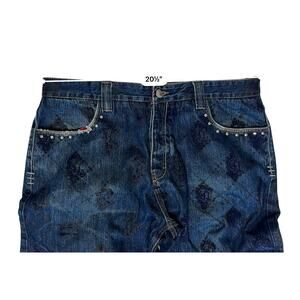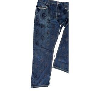 Crown Holder Vintage Button Fly Velvet Gem Embroidered Blue Jeans 40x34 Hip Hop. Printed diamonds with velvet insets, baggy legs along with eye catching Silver stitch embroidery, Crystal gems and studding embellishing back pockets. In overall excellent gently used condition. The last button on fly was replaced. See photos. No known rips, tears, holes, stains or defects other than above mentioned. Dry clean for the longevity of the garment.