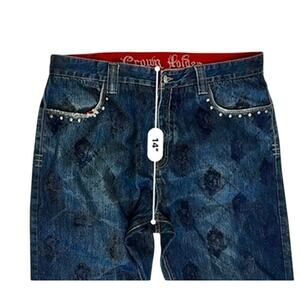 Crown Holder Vintage Button Fly Velvet Gem Embroidered Blue Jeans 40x34 Hip Hop
