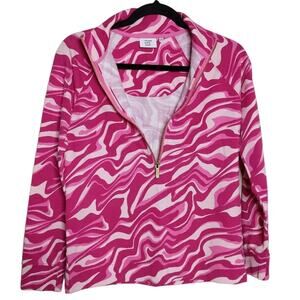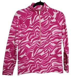 Print has waves in shades of pink. Half-zip pullover. Zip up for warmth or open to cool down. Long sleeves. Pulls on over head.