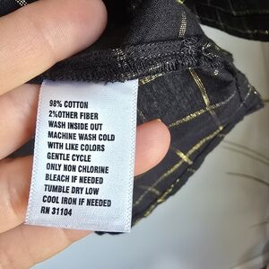 Lightweight, Woven Fabrication. Black w/ Gold Metallic Plaid Print.