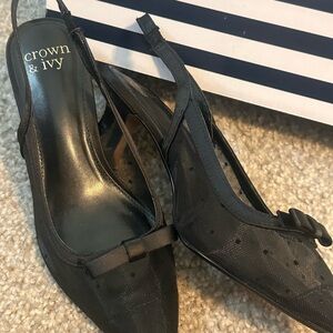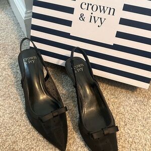 Chic black slingback heels by Crown & Ivy. Features a stylish bow accent. Ideal for elegant outings.