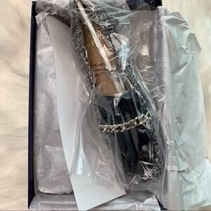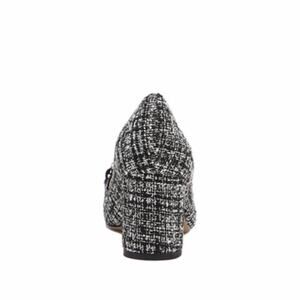 Chic black and white heels. Tweed texture with patent finish. Chain detail on the front.