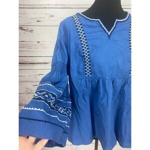 Crown & Ivy Blue White Embroidered Bell Sleeves Size Large Women's Blouse