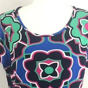 Crown & Ivy blue, green, black, and white flower dress. It has scalloped hemline and short sleeves. Keyhole opening, button closure at nape of neck. Super cute and funky, bright abstract flower print. Gently used...size PM...no flaws...RN 31104...See photos for care details.