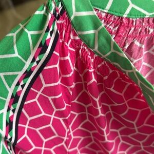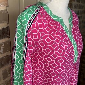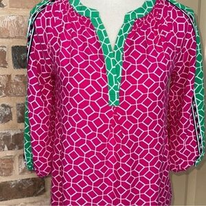 Crown & Ivy Boho Pink & Green Geo Print Popover Tunic Top Smocked V-neck Sz XS