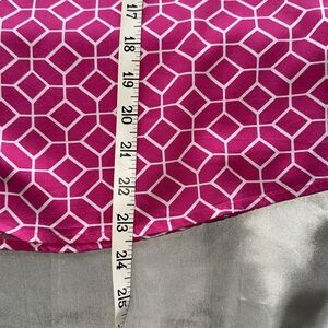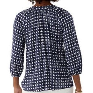 Effortlessly charming, this lovely top from Crown & Ivy is adorned with a vibrant pink print and finished with a smocked detail contrasting green split neckline and black and white accented sleeves for a captivating look. Rounded hem. Elasticized 3/4 blouson sleeves. Stock photos for fit and style only. The actual blouse is pink and green. Approximate measurements in photos. Excellent condition.