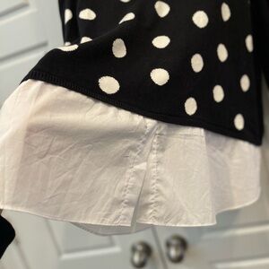CHICOS Woman’s CALLIE Pullover Sweater is NWT,Black and White Polka Dot. 3/4 Sleeve, Collar / Cuff / Hem are White Cotton Fabric: