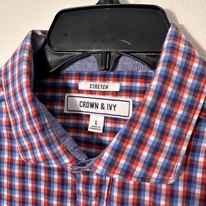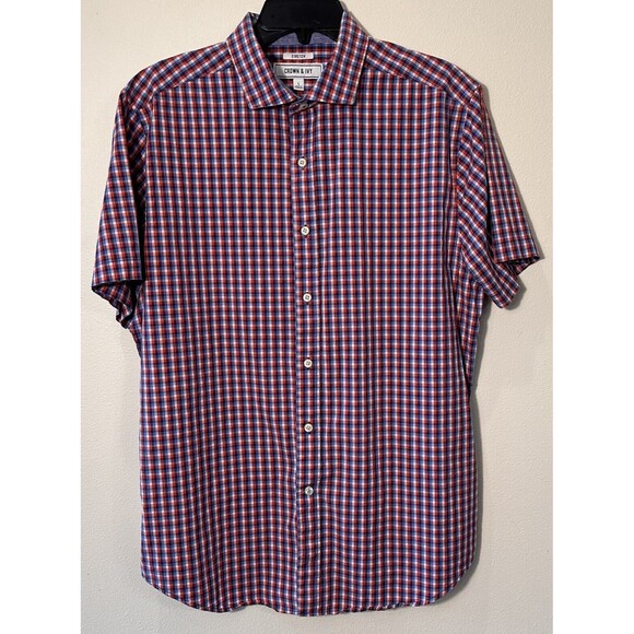 Dress up or dress down with the versatile Crown & Ivy Classic short sleeve button-up shirt, a must-have for any wardrobe. The Mens Size L shirt features a vibrant red and blue plaid pattern that brings a pop of color to any outfit, making it perfect for casual outings or travel adventures. With a comfortable regular fit and short sleeves, it's an ideal choice for all-season wear.