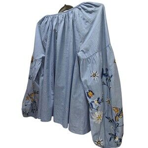 Beautiful Crown & Ivy embroidered boho blouse in a light blue stripe design. Features vibrant embroidered butterflies and flowers on the sleeves, tassel ties at the neckline, and a lightweight relaxed fit. Perfect for casual wear, festivals, or spring and summer outings.