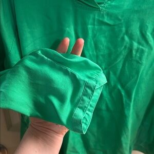 Elegant emerald blouse featuring a charming ruffle neckline. Ideal for versatile styling.