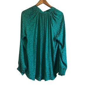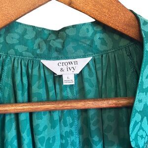 Keywords: Crown & Ivy, Emerald Green Blouse, Leopard Print Top, Long Sleeve Blouse, Tassel Tie Neck, Bohemian Blouse, Casual Blouse, Work Blouse, Womens Top, Jewel Tone, Relaxed Fit, Flowy Blouse