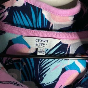 Long sleeve pullover from Crown & Ivy. Fun flamenco print. Lightweight fleece fabric. Buttons at neckline. Size M. Approximate flat lay measurements- Bust: 19.5” across from armpit to armpit. Length: 25”. Gently preowned condition with no tears or stains.
