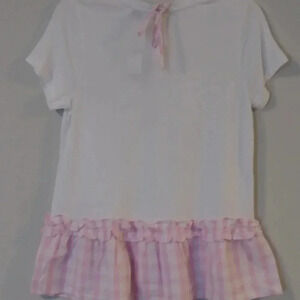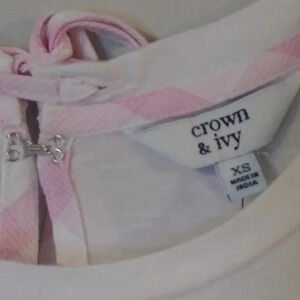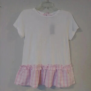 Crown & Ivy Garden Party II Top. White with pink and white checkered ruffled bottom. Tie back and hook & eye closure. NWT