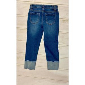 These Crown & Ivy jeans feature a medium washed denim, cropped folded raw hems with a slight embroidery, a mid rise, and a relax regular fit.