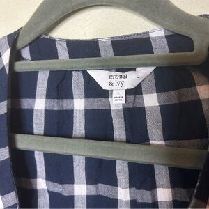 tags: checkered blouse, navy blouse, Crown Ivy top, large blouse, button-up blouse, casual blouse, plaid shirt, plaid blouse, women's blouse, trendy blouse, casual wear, fall blouse, checkered shirt, button-up top, navy shirt, plaid pattern, classic blouse, office blouse, everyday blouse, wardrobe staple, checkered pattern, feminine blouse